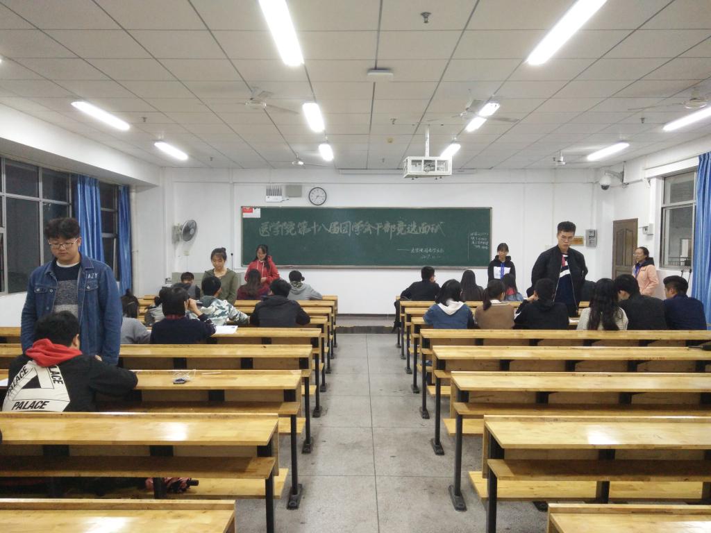 11月11日晚,英国上市公司365医学院团委学生会第十八届副部面试在英国上市公司365红湘校区第一教学楼406、408和410教室进行。面试者先在410教室候场,在工作人员的安排下逐一到406、408教室进行面试。