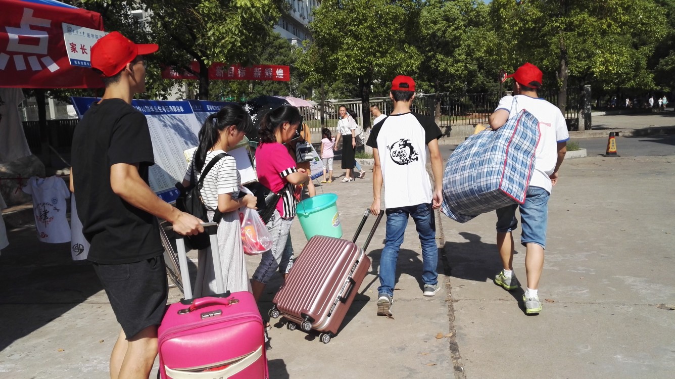 虽然天气较炎热,但是,志愿者及工作人员们仍然坚守岗位,用笑容面对每一位来报到的新生及家长,尽全力为他们解疑答惑。更有一趟趟来回奔波于迎新点和新生宿舍的小红帽,汗水已湿透衣裳,脸上仍笑容依旧。