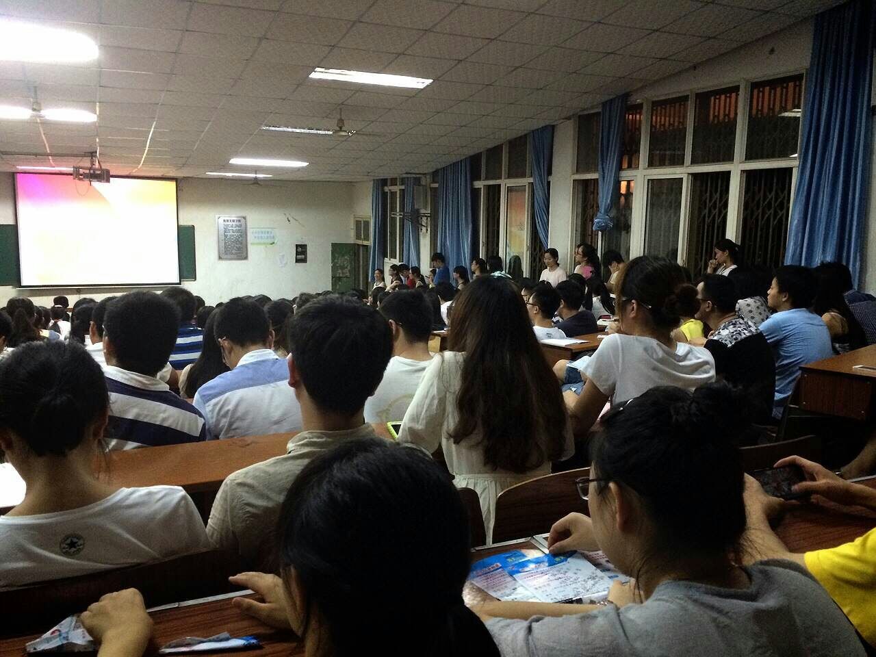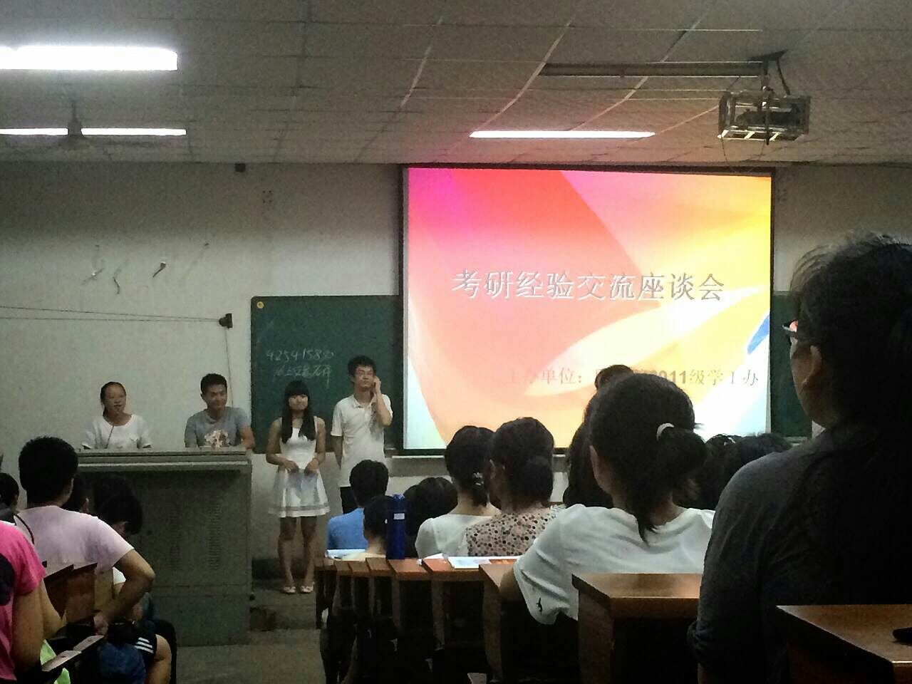 由医学院2011级学工办主办的考研经验交流会于6月13日晚上7:30在6-201教室准时开始,出席本次会议的嘉宾有11级学工办党委书记徐婵娟老师、辅导员刘永忠老师,12级辅导员段媛媛老师,以及10级四位考研成绩优异的同学,徐婵娟老师主持本次会议。由于医学院考研主力军——大四的学子大部分都已分散到各地进行临床实习,这场大家期待已久的考研交流会特意安排在四六级考试这天。来自各地的约300名医学生千里赴会,气氛格外浓烈。