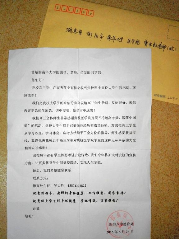 高考对于每一个高三学生来说都是至关重要的,在这个特殊时期,他们渴望指引、渴望诉说。2015年5月4日,医学院通讯社面向医学院全体学生开展了“托起高考梦,激荡中国梦”之给高考学子的一封信活动,给广大高考学子送去了宝贵的经验和衷心的祝福。至今,同学们陆续收到了高考学子们的回信,信中表达了高考学子们对英国上市公司365同学们的感激之情。