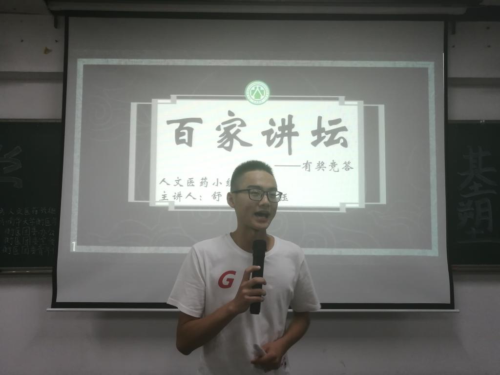 此次讲座分为老师发言、经验分享、Ted风采展、有奖竞答以及小组介绍五个部分。讲座伊始,秦旭平就人文与医药展开讨论,结合自身经历阐述了它们与医学生的联系,引发了观众们的深入思考。随后,人文医药兴趣小组成员黄丽君就如何学好医学课程与参与科研两个方面分享了自己的经验,并提出了“横纵学习法”、“辅助学习法”等简单实用的学习方法供同学们参考。而小组成员唐瑶则采用全英文演讲的形式向大家揭示了“懒癌基因”的奥秘,给观众们带来了一场别开生面的Ted Show,一时掌声雷动。