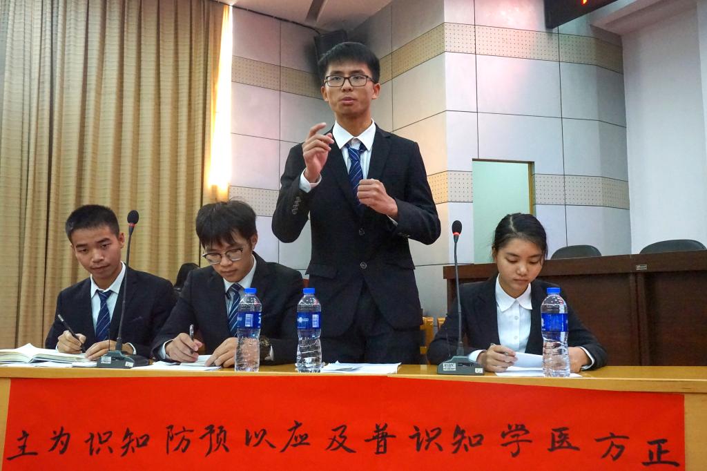 短暂中场休息之后,比赛迎来冠亚之争。正方队伍临床医学23、24班坚持“医学知识普及应以预防知识为主”的观点,从“预防知识的普及是当下最有效、最有利的手段”的角度立论。反方队伍临床医学26、27班则认为“医学知识普及应以治疗知识为主”,从“治疗知识的普及对疾病的治疗和危急情况的抢救的重要作用”突破,进而提出全民健康的实现有赖于“以治疗知识为主,预防知识为辅”的医学知识普及模式。质询环节中,双方你来我往,互不相让。反方抓住预防知识与起预防作用的知识的区别,驳斥正方观点。随后的自由辩环节更为精彩,双方针锋相对,举出各种与医学相关的实例,进行了多方位、多视角的提问与做答,进一步充实各自的观点。在观众提问环节中,双方观众也不甘示弱,针对对方的辩论提出了自己的疑问。最终,临床医学26、27班摘得桂冠。