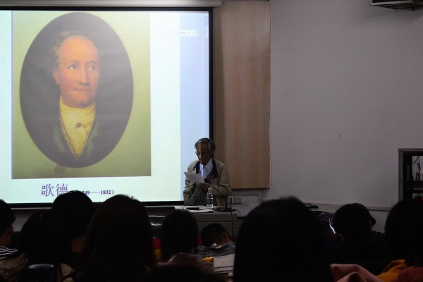 “今天我们的主题,是名著的阅读和理解。”马文韬教授由浅及深,从国人耳熟能详的中国四大名著引申到欧洲的四大名著,以古典《道德经》中“大器晚成”在现代汉语中的误用为例提出阅读《浮士德》原文的中肯建议,引得众学子一阵思索。在基本介绍完《浮士德》的剧情后,马文韬教授又在细微之处,与同学们展开讨论,“显然,浮士德的精神,我认为其中科技发展的背景与歌德的克制,容忍的思想相违背,因此在这个地方也要重新讨论……”马教授细心的讲解,系统的理论,理由充分的质疑,让台下的师生听得十分专注,唯恐错漏一刻。