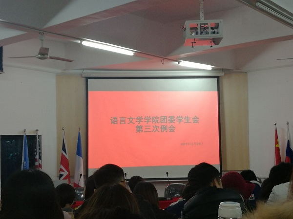 11月23日晚,语言文学学院第一届团委学生会于模拟联合国会场召开了第三次例会,辅导员杜百知和周玲出席此次会议,团学会全体成员及各班班长参加。