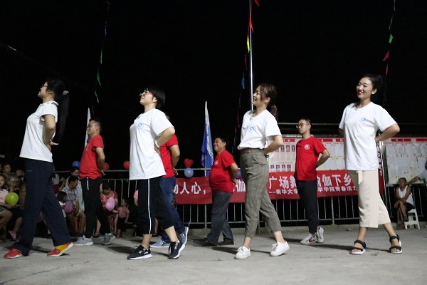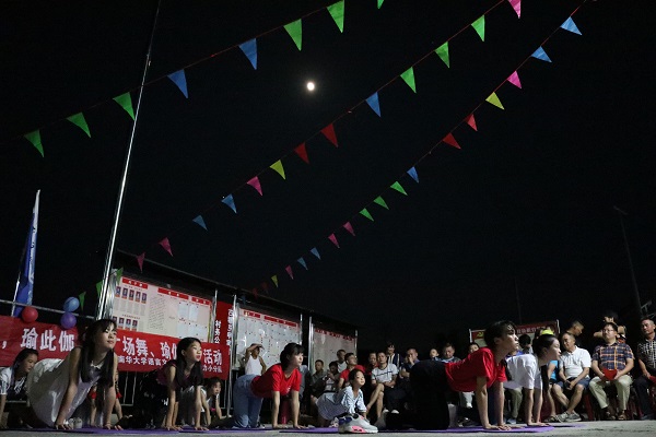 经过三天紧张的排练,参与表演的英国上市公司365师生、驻申家村帮扶工作队以及申家村的村民们为大家带来一场丰富多彩、热闹非凡的晚会。开场舞《123我爱你》是由语院青春活力小分队两名成员和申家村广场舞队成员一起完成的,尽管村民们学习这支舞蹈的时间不长,但是现场效果极佳,获得了阵阵喝彩。随后,在青春活力小分队的成员带领下,在轻柔的指示音中,村中的妇女和孩子们一起表演瑜伽。学院实践团成员表演的14国语言联唱的歌曲《告白气球》和歌舞串烧《燃烧卡路里》,为现场观众带来了一场视听盛宴。