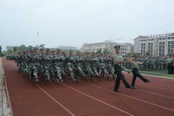 升国旗后,军训汇报表演正式开始。随着解放军进行曲的响起,六个团的下属连队依次以分列式的形式经过主席台接受审阅。“身姿矫健,气宇轩昂,迎面走来的是五团一营一连的方阵,他们由语言文学学院汉语言文学专业和日语专业的学生组成”,从主席台下走过的语院学子着装整齐,步伐统一,“海阔凭鱼跃,天高任鸟飞”,经过了十余天烈日与风雨的洗练,他们展现出了刚强姿态。