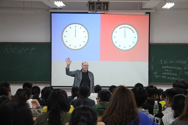 来自澳大利亚的外教Robert首先介绍了自己的名字以及国籍。随后他以中西方文化差异为主线展开演讲,他用内容丰富多彩的PPT展示出文化差异的图片,让在场学生更加贴切地感受到体现在生活中的西方文化差异。幽默风趣的Robert用图片引导学生们积极讨论中西方的饮食、运动和生活方式等等。另外,Robert还非常热情地分享了自己来到中国的经历,并且向学生提出了一些有趣的问题,同时耐心解答了学生的提问。Robert全程语速适中、发音清晰、内容丰富,极大程度地调动了学生的学习热情。现场气氛热烈,学生们都踊跃参加活动。