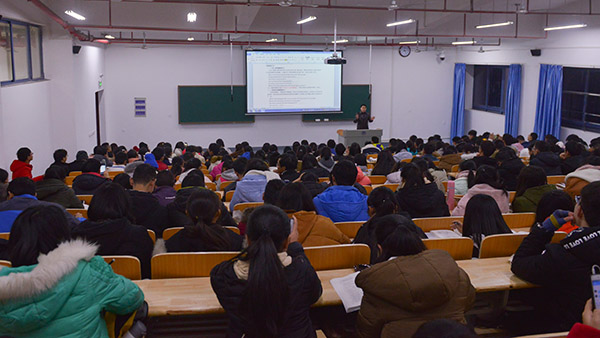 在讲座开始前,学生们就已经早早地到达了会场,偌大的教室里座无虚席。学生们大多都带着纸和笔,聚精会神地听着。李先进深深地感受到了学生们的热情,上台作了简短的自我介绍后便正式开讲。首先,他在大屏幕上向学生们展示了此次英语期末考试的考试大纲。然后就本次期末考试的考试形式、考试内容作了简要介绍。然后,李先进就之前提到的考试形式和内容提出了一些备考要求和考试技巧。他提到此次期末考试,无论是考试题型还是考试内容,大多都来自课本以及课后作业,甚至会有不少书上的原题。因而他强调备考时一定要以课本为主,重视基础训练和总结积累。接下来,他就阅读理解、翻译、听力等几大板块分别提出了实用的备考建议,根据自己的出卷经验,从出题人的角度带领大家逐一分析这几大板块的出题“套路”并提出了“破解之术”。李先进的语言风趣幽默,各类例子信手拈来,令在座的学生们时而开怀大笑,时而认真记录,营造了良好的现场氛围。此外,他结合自己三十多年的教学经验,向学生们介绍了学好英语这一学科需要的思维方式和特殊技巧。