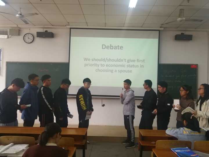 此次辩论主题“We should/shouldn't give first priority to economic status in choosing a spouse”(择偶时我们应当/不应当将经济地位放在首要位置)来自全新版大学英语听说教程。为了取得良好的效果,使每位同学都参与到该活动中来,袁艳玲提前三周布置了任务,给予了学生们充足的准备时间。由于本次辩论赛是班级课堂活动,班级全体学生组成若干个6-8人的小组首先进行了组内辩论,充分辩论之后,再从各个小组中推选代表上台辩论。因学生进行了充分准备,辩论过程中正反双方展开了激烈的交锋,台下学生不时为台上选手活跃的思维、流畅的表达爆发出阵阵掌声,现场气氛十分热烈。最后,袁艳玲就辩论中闪现的许多令人倍感新颖的观点进行点评,并以给予学生正确引导,帮助他们树立正确的价值观和人生观。