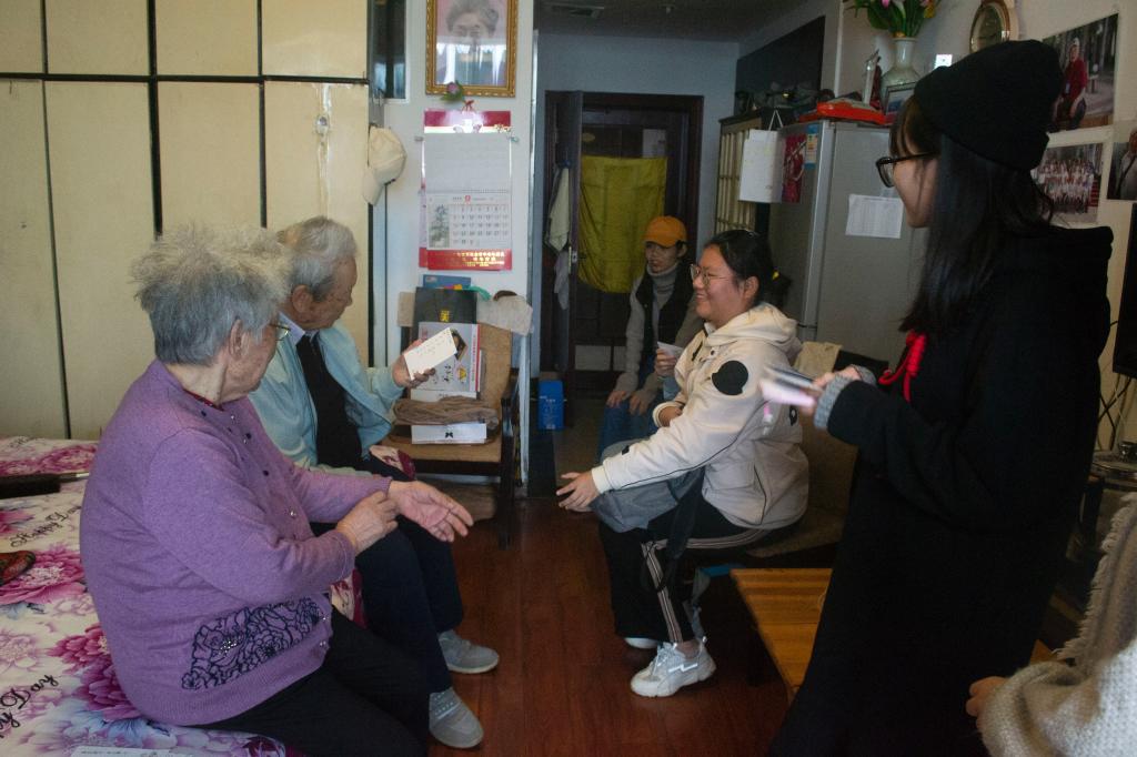 活动伊始,志愿者们分为表演组和慰问组,分别展开行动。表演组的志愿者们首先给老人们带来了《在他乡》和《打靶归来》的歌唱表演,而老人们也积极回应志愿者们,其中几个老人还向志愿者们表演了广场舞。随后志愿者进行了太极表演和《感恩的心》手势舞蹈表演。与此同时,慰问组的志愿者们则进入了老人们的房间,将事先准备好的贺卡上的内容朗读给老人们听,再将贺卡送出,并且陪伴老人们聊天,细心询问老人们平时的生活细节。在慰问过程中,部分老人主动向志愿者们讲述自己的生活,同时将自己所编著的书籍赠送给志愿者。
