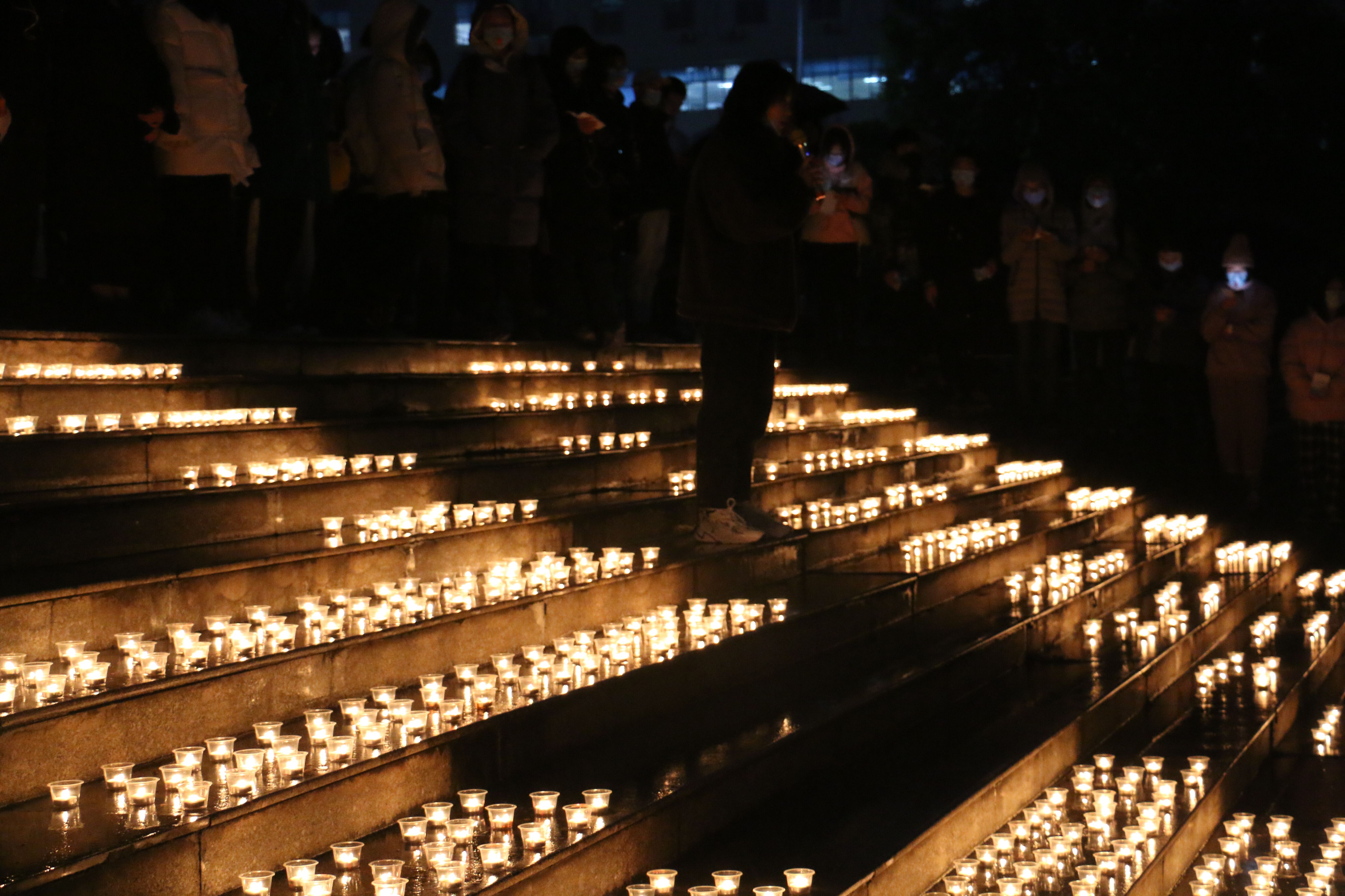 寒风凛冽,细雨淅淅,但这并没有阻碍志愿者们祈福的脚步。在南华广场阶梯处闪耀着“121”和红丝带的烛光。随后,所有人庄严宣誓:“在第33个世界艾滋病日来临之际,我志愿成为抗击艾滋病的一员,······以青春为炬,点亮反歧视之光,向零艾滋迈进。”从点亮蜡烛那一刻起,志愿者们为所有艾滋病患者祈福三十秒,倡导平等、反对歧视。