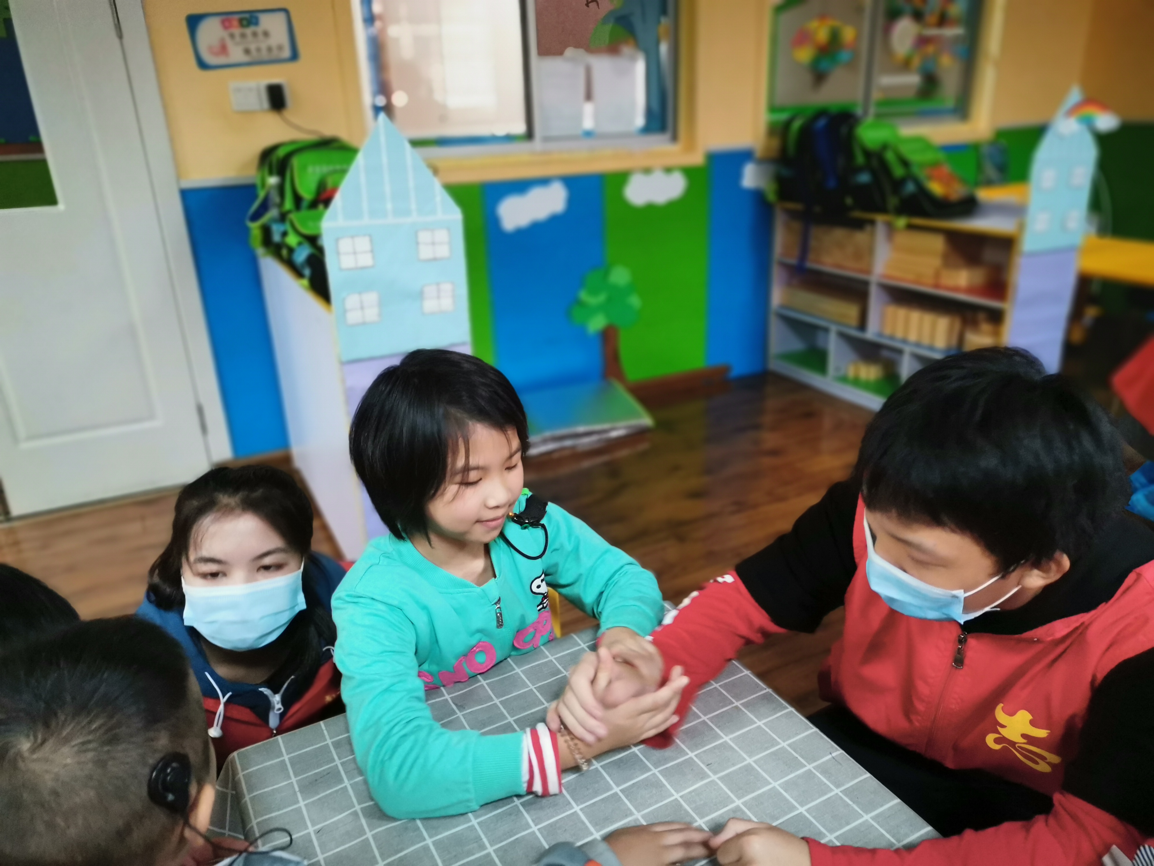活动开始后,志愿者分别进入对应班级,热情地与各位小朋友进行互动。志愿者们对不同年龄层的儿童采取不同教学方法——教授难度等级不一的舞蹈和手工品,开展各具特色的游戏。大班儿童在大厅内进行爱的抱抱游戏。几轮拥抱游戏过后,孩子们和志愿者们逐渐亲近,听到游戏口令时都紧紧地抱住守护他们的志愿者,场面十分活跃温馨。中班儿童在志愿者们的带领下完成了小章鱼的制作,孩子们纷纷兴高采烈地展示着自己的作品。听障儿童们或带有助听器或耳内旋有耳蜗,因此志愿者们在互动过程中也非常谨慎小心。遇有性格较内向的儿童时,志愿者们通过鼓励、引领和优先让其参与游戏等方式让内向儿童逐步融入集体。期间,部分听障儿童愿意且能够与志愿者们进行简单的交流,孩子们稚嫩的脸上洋溢着灿烂的笑容。