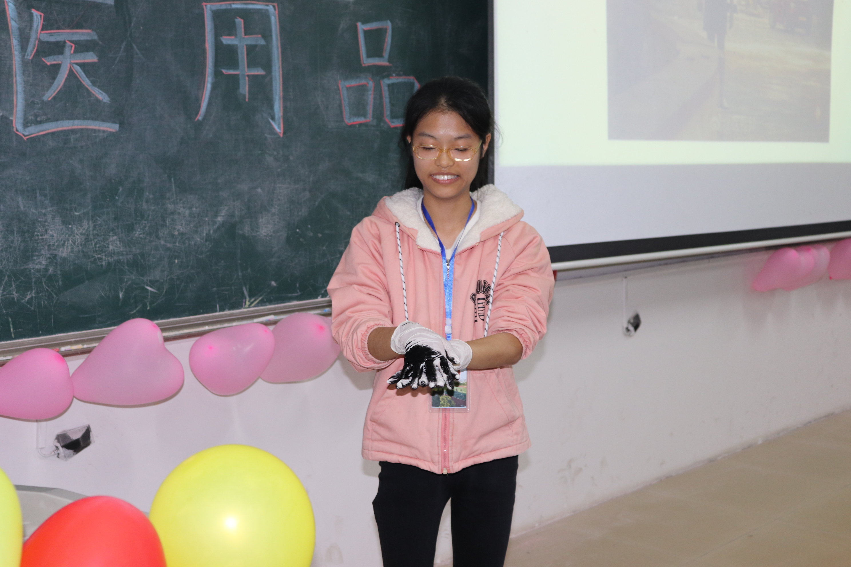 讲座一开始,黄静辉同学以医用品的概念引导同学们了解疫情期间常用医用品口罩、护目镜、防护服、酒精、棉签等。随后,黄静辉同学提出问题:我们生活中常用的医用品有哪些?在场学子纷纷积极回答。接着,现场工作人员通过医用纱布口罩和普通口罩为同学们展示如何正确使用口罩,并对比错误使用口罩的视频,强调口罩使用应贴合面部与耳缘使其不脱落等细节,潜移默化间提高在座学子们的医用环保意识。随后,在主持人与现场参与者互动中,工作人员以墨水形象生动地展示洗手液的覆盖过程,并在场演示七步洗手法——首先向内润洗洗手液,再按照外部指缝、手掌侧指缝、指背、大拇指、指尖、手腕的顺序依次清洗,整个清洗过程应持续15秒钟。最后,黄静辉同学分别讲述医用品使用后出现的系列问题——环境污染、过度浪费、传播病害。在提问环节中,一位同学就处理口罩清晰发言——使用过的口罩应依次沸水处理、剪碎口罩、袋子包装,最后放进医用废箱。他同时指出剪碎目的是防止黑心商人二次贩卖以及拾荒老人收捡可能附着病原体有传播风险的口罩,使在场学子对口罩处理认识更加全面。