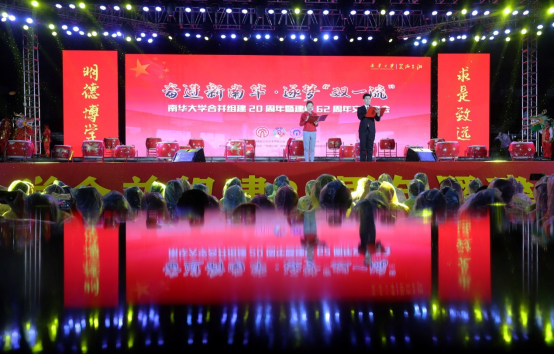 晚上7:30分,气势磅礴的民乐、激情澎湃的鼓声响彻整个校园,大学生艺术团与体育学院龙狮队联袂演出的《丰收锣鼓》正式拉开了晚会帷幕。紧接着,一曲歌颂南华人为国家核工业和医疗卫生事业发展所作突出贡献的合唱《祖国不会忘记》,开启了“求索篇”的序章。在“笑满三湘”文艺志愿者《辉煌南华》的快板节奏下,现场的每一个南华人都感到无上光荣。大学生艺术团带来的舞蹈《马兰花魂》,音符跳跃,舞者婀娜,每一个动作,每一个姿势,都在赞美着南华核特色医品牌的完美融合,都在表达着对学校合并组建20周年暨建校62年生日的祝福。