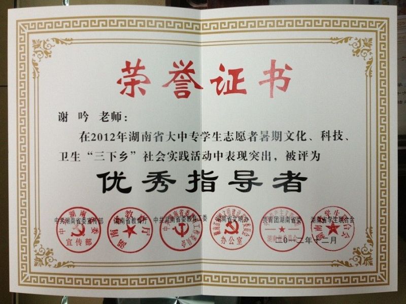 谢鸣老师在2012年湖南省大中专学生志愿者暑期文化、科技、卫生“三下乡”社会实践活动中被评为优秀指导者