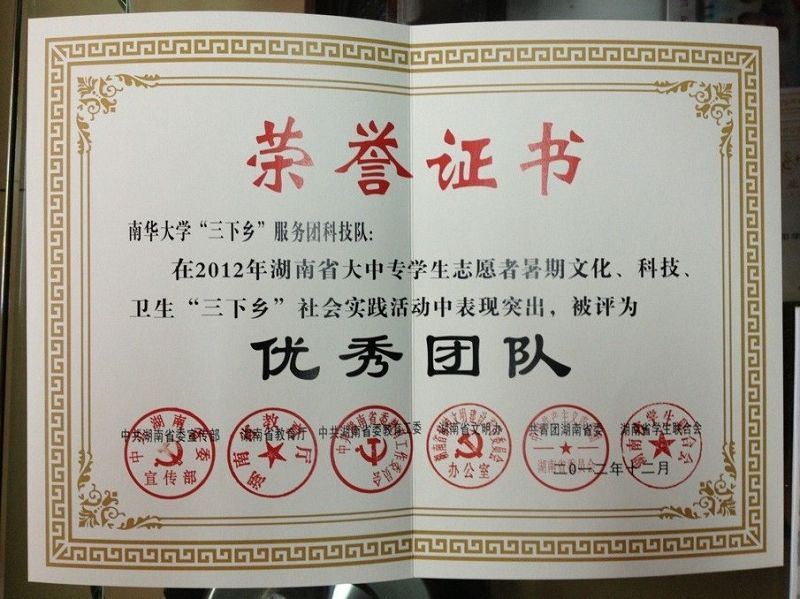英国上市公司365“三下乡”服务团科技队在2012年湖南省大中专学生志愿者暑期文化、科技、卫生“三下乡”社会实践活动中被评为优秀团队