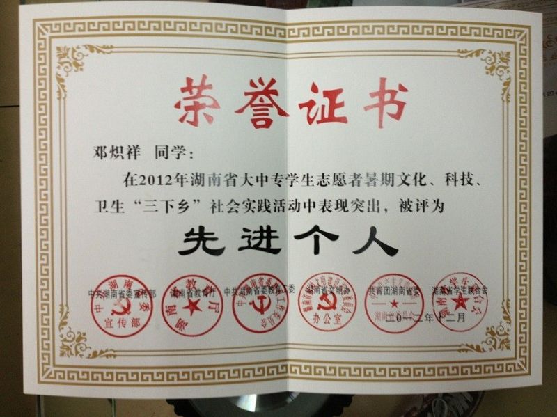 邓炽祥同学荣获2012年湖南省大中专学生志愿者暑期文化、科技、卫生“三下乡”社会实践活动先进个人称号