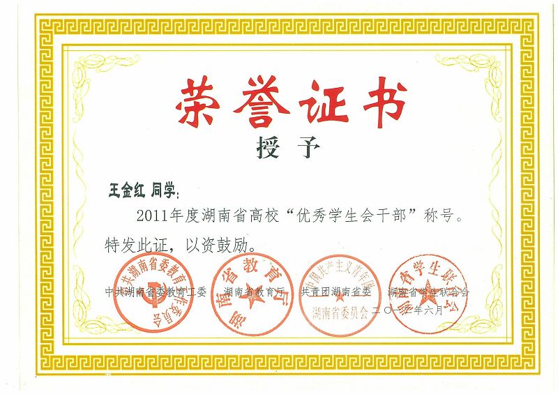 王金红同学被授予2011年度湖南省高校“优秀学生会干部”称号