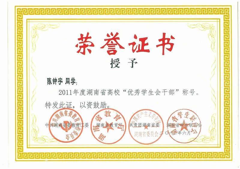 陈钟宇同学被授予2011年度湖南省高校“优秀学生会干部”称号