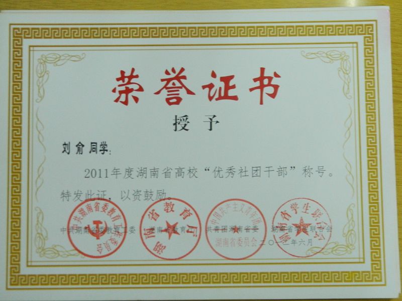 刘俞同学获2011年度湖南省高校“优秀社团干部”称号