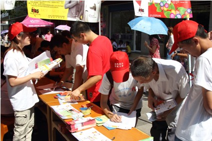 防艾队积极发放防艾小册子、扑克等宣传资料