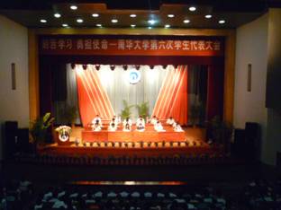 最后,校团委副书记谢铷鸿致闭幕辞。她向第五届学生会委员会表示衷心感谢,向第六届学生会委员会表示真诚祝贺并寄予殷切期盼:继往开来,再创辉煌,高举中国特色社会主义旗帜,深入贯彻落实科学发展观,按照胡锦涛总书记在清华大学校庆100周年上的重要讲话对青年学子的要求,秉承我校明德博学、求是致远的校训,坚定理想与信念,为学生会工作迈上新台阶奉献智慧与力量,谱写出南华学生会工作新篇章。整个会场洋溢着团结,民主,交流,进步的气息,体现了南华学子强烈的使命感与主人翁意识。最后,在嘹亮的校歌声中,我校第六次学生代表大会圆满落幕。