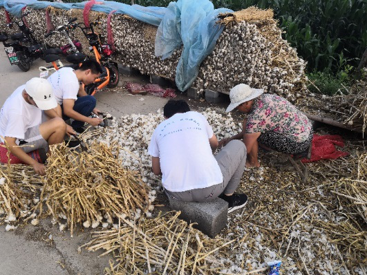 当天上午,团队顺利抵达卞庄镇,秉着凡事预则立,不预则废的原则,我们稍作休整后讨论接下来的行程安排,以及准备在南小庄村考察路。当天下午在村里,团队成员主动拾取地面上的垃圾,正巧,赶上当地大蒜收获的季节,看着村民们忙碌的身影,我们热心的帮助村民剪大蒜,用实际行动帮助村民们解决问题。